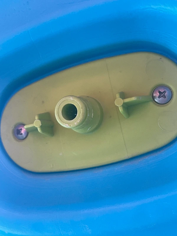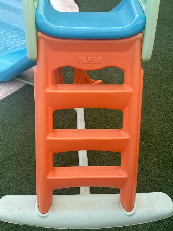 Tobogán de plástico Feber usado, en buen estado. Colores azul, naranja y verde. Tiene opción de conectar manguera para agua.