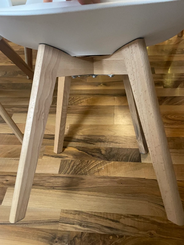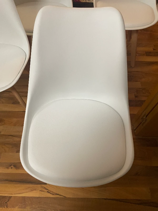 Vendo 4 sillas de comedor blancas con patas de madera. Son de polipropileno con cojín fijo, no tienen marcas ni manchas, usadas muy poco tiempo. - Color blanco - Patas de madera - Estado: muy buen estado - No tienen desperfectos ✨