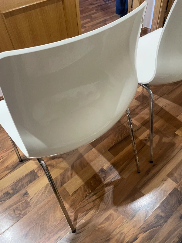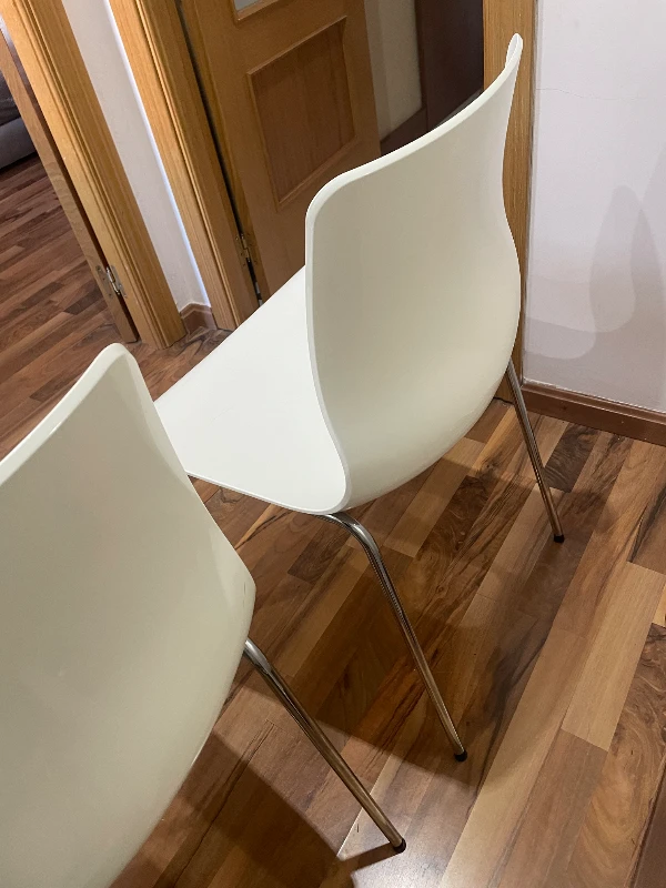 Vendo tres sillas blancas de Ikea, usadas pero bien cuidadas. Son de plástico con patas metálicas. Sin manchas grandes ni roturas, sólo leves marcas de uso.