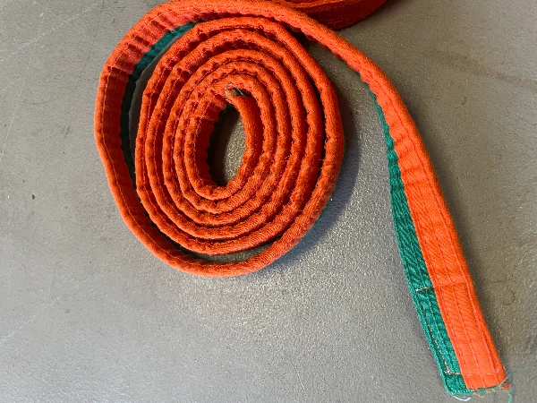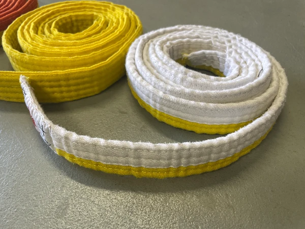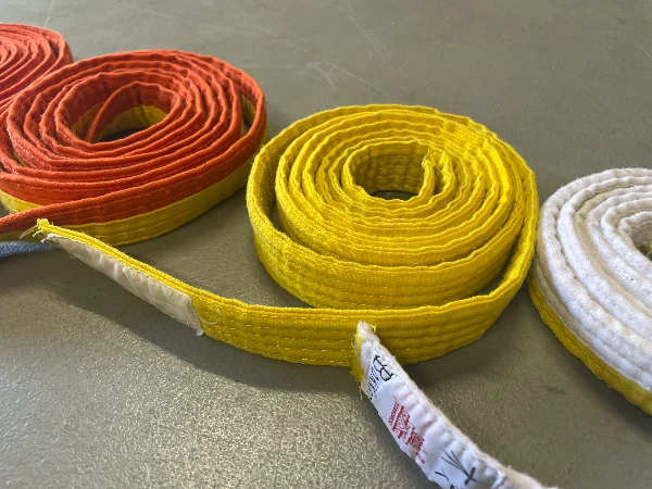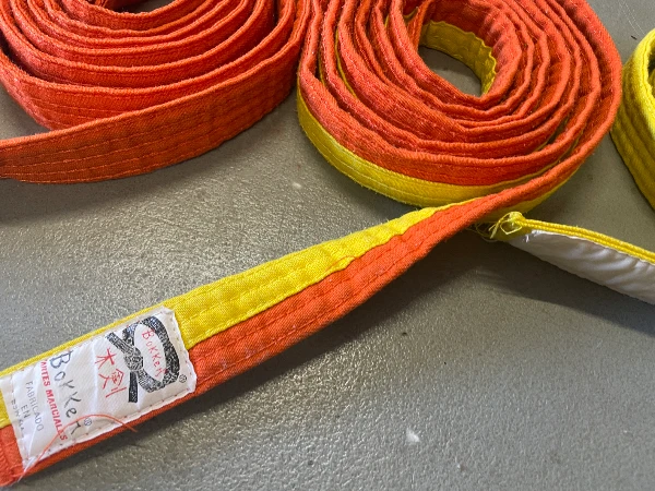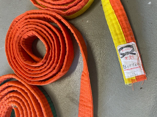 Lote de 5 cinturones para artes marciales, talla infantil. Colores: blanco, blanco - amarillo, amarillo, amarillo - naranja y naranja. Marca Borken. Están usados pero limpios.