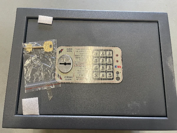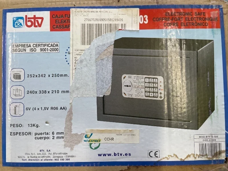 Caja fuerte electrónica BTV E-103. Estado: sin usar, la saqué de la caja solo para las fotos. Color gris oscuro. Incluye 2 llaves y está todo en su embalaje original (la caja de cartón está un poco rota). - Medidas: 25x34x25 cm - Funciona con 4 pilas AA🔋 - Peso: 13 kg